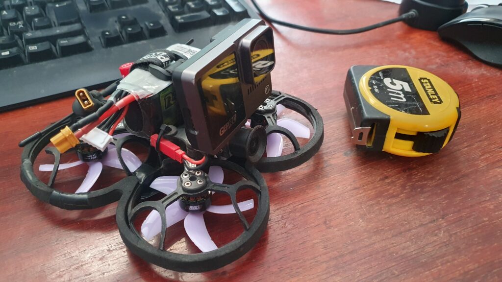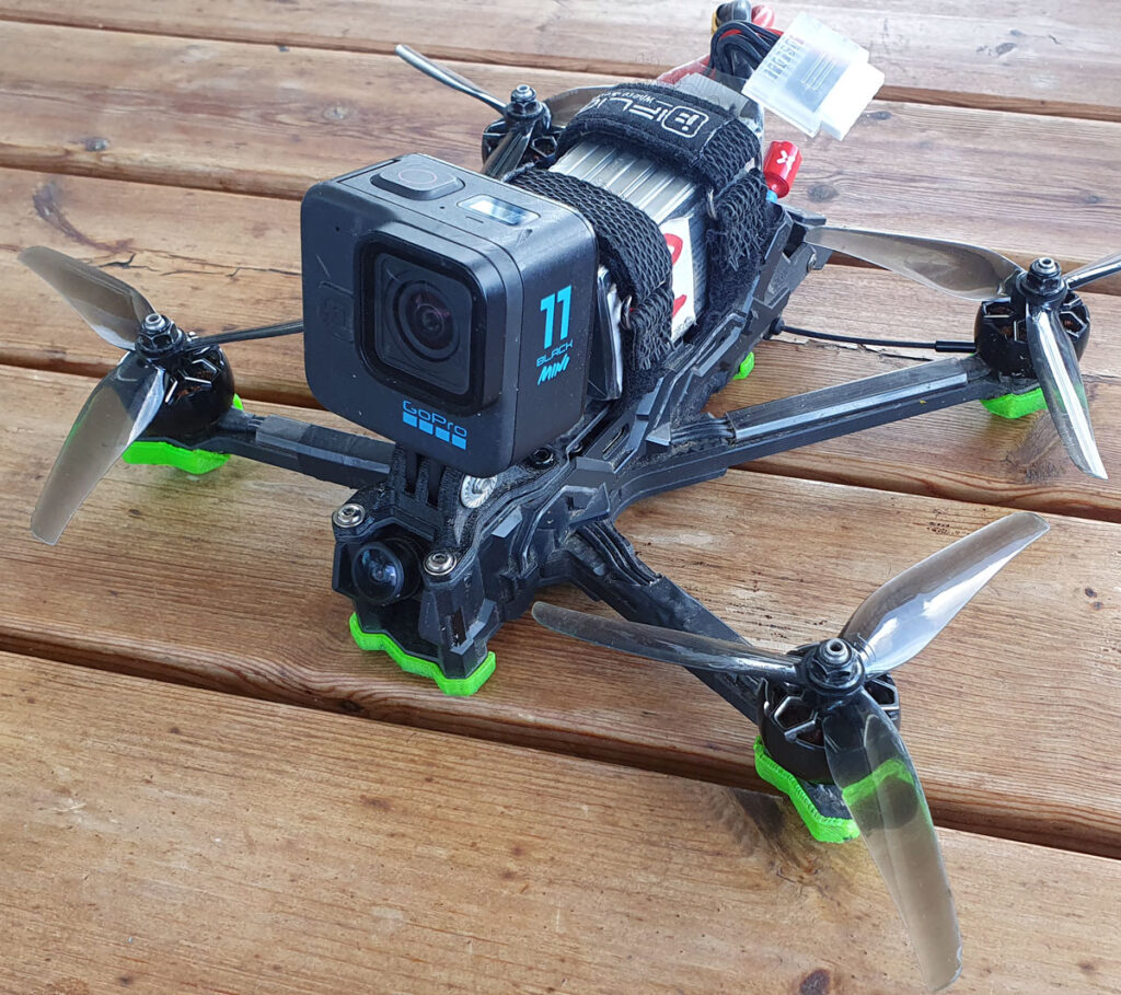 Kuvassa on pienin FPV kopterimme, jolla lennetään vain sisällä. Se painaa noin 280g. Edessä alhaalla on kamera, jonka näkymä siirretään pilotin videolaseihin. Se yläpuolella on tallentava Gopro11 -kamera, johon on vaihdettu kevyet kuoret. Sillä kuvataan laadukasta 4K50FPS materiaalia.